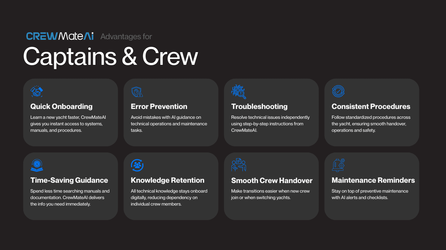 CrewMateAI helps captains and crew stay in control, consistent, and efficient, from day one.